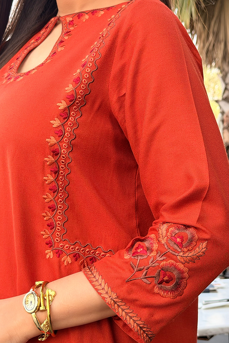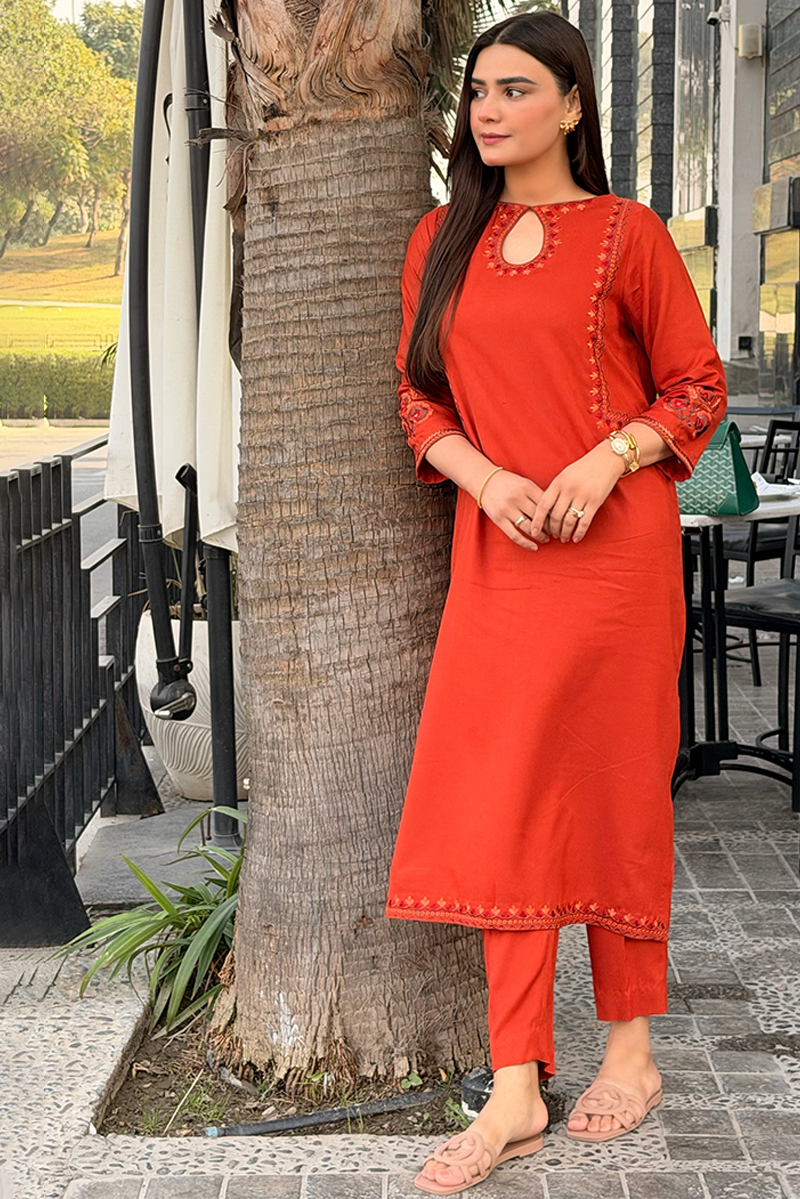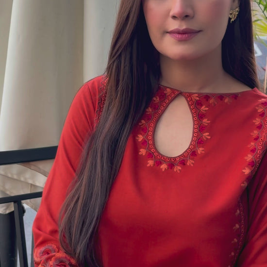This burnt-orange kurta made on premium marina fabric paired with straight trousers. The minimal kashmiri embroidery style on the kurta front makes it a perfect everyday look.