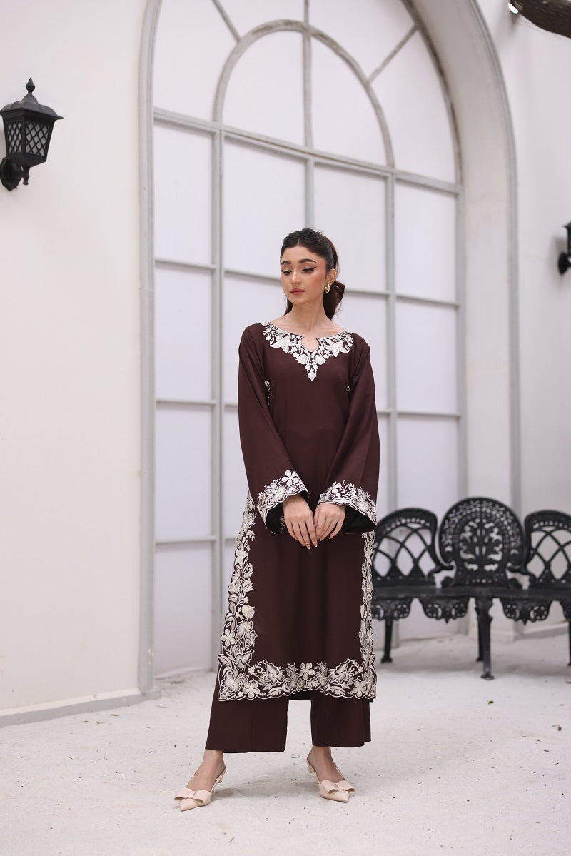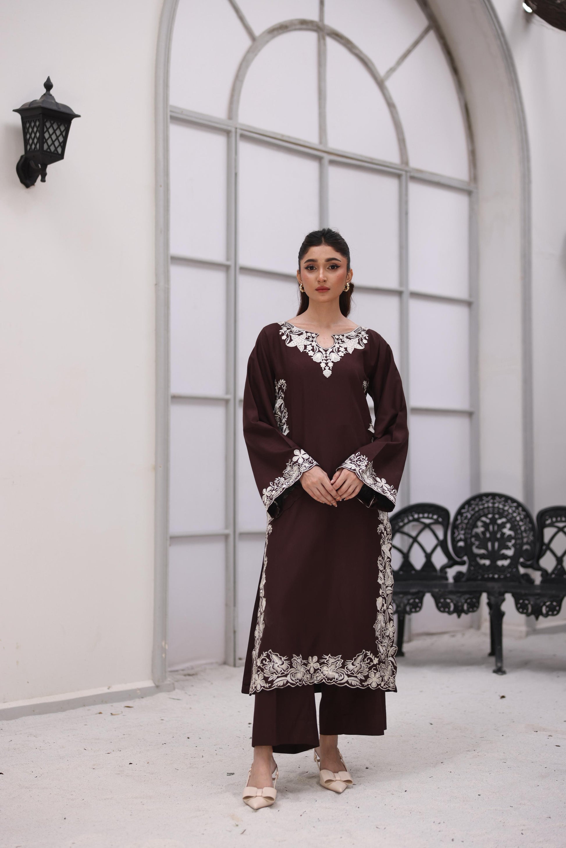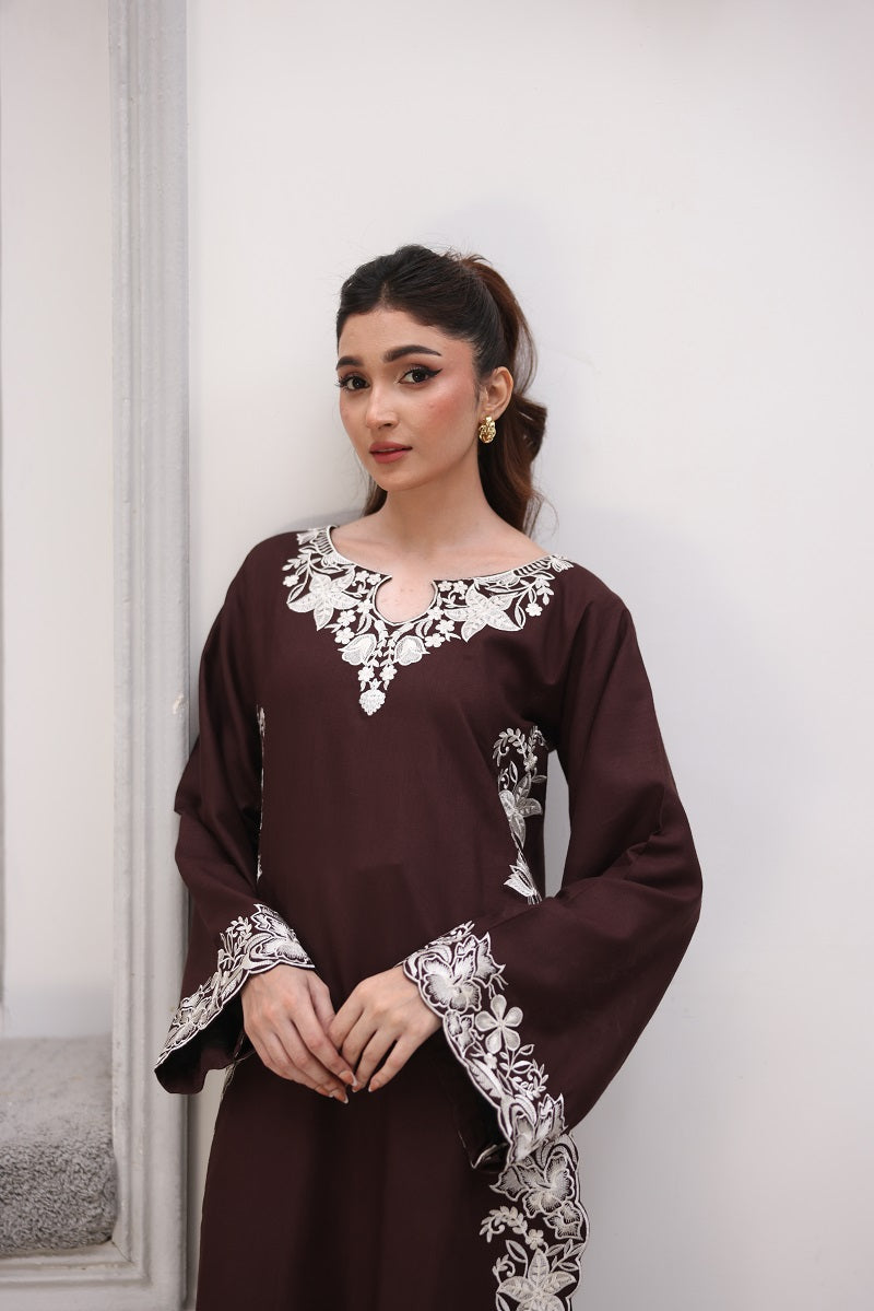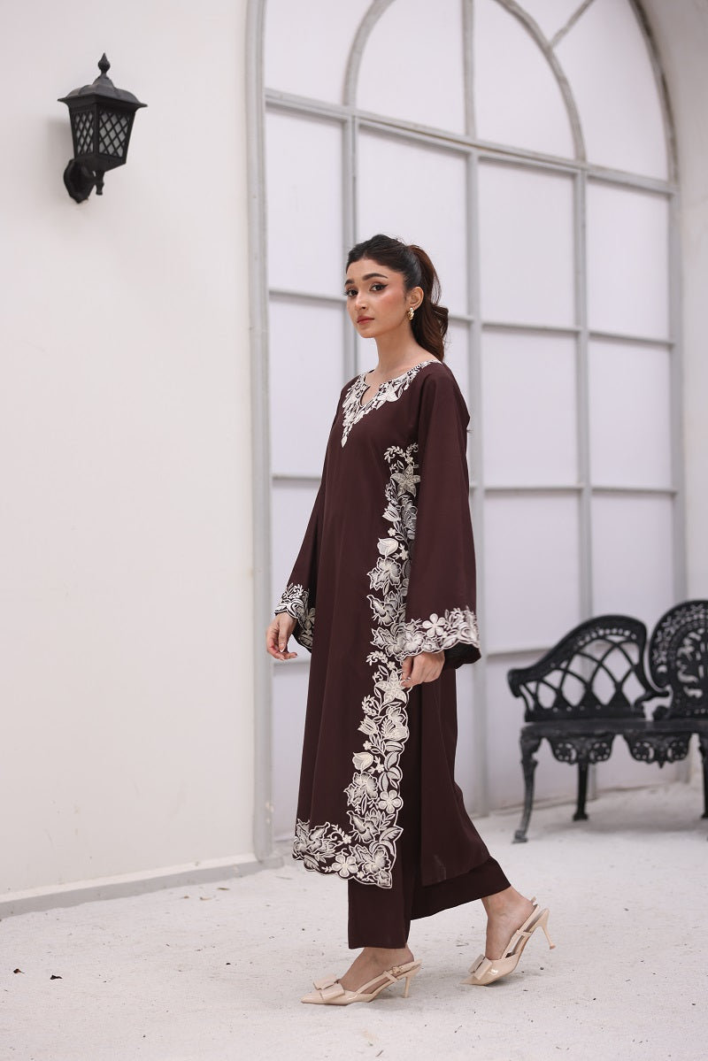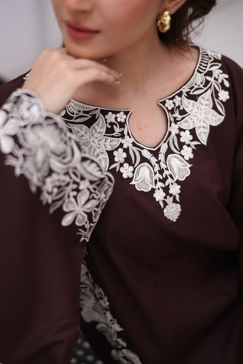 In a rich coffee brown, this 2 piece comes with cutwork on hem and sleeves. The intricate off white embroidery details on a kurta style long shirt paired with loose fit trouser pants.