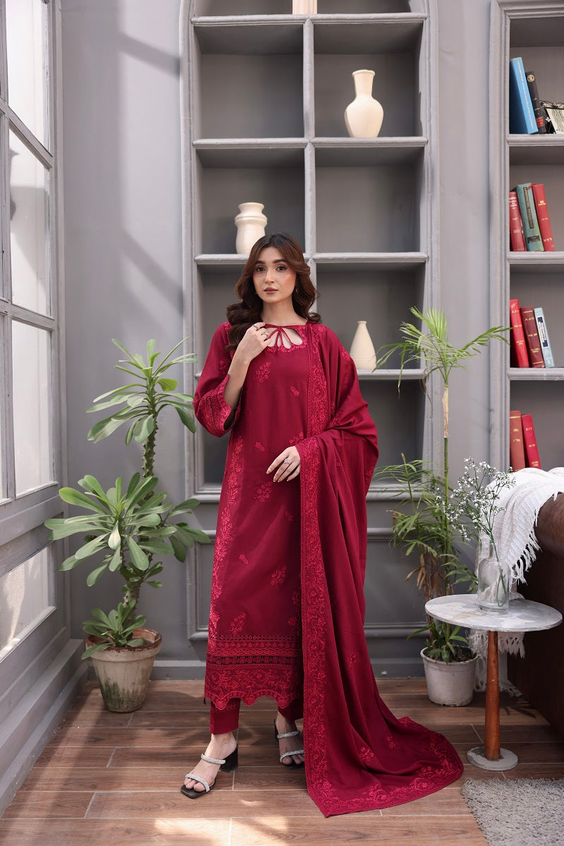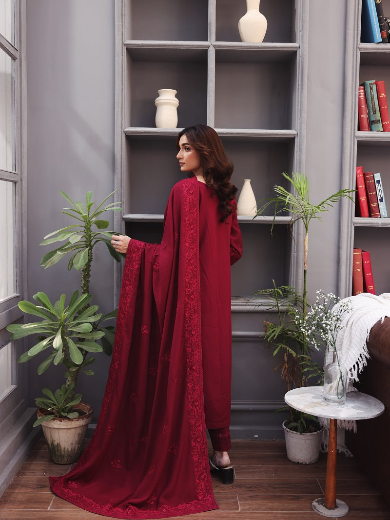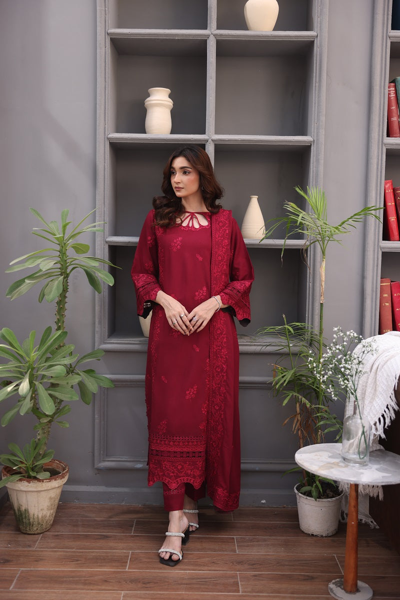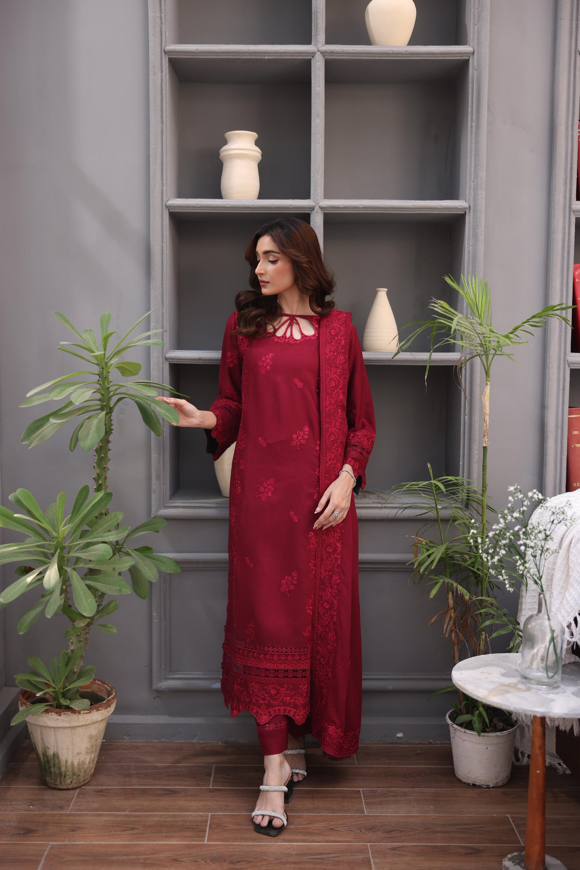 A rich 3 piece mulberry outfit made on the finest karandi contrasted with intricate embroidery across the shirt, sleeves and shawl. The cutwork neckline and the detailing gives it a bold yet subtle look. It comes with straight pants with lace detailing to complete the look.