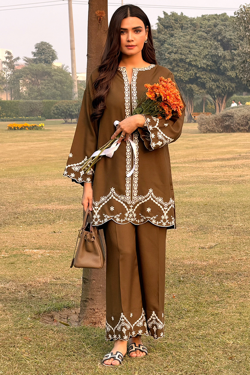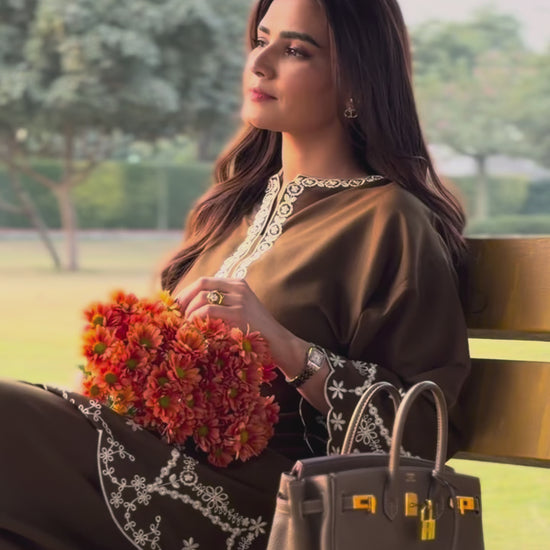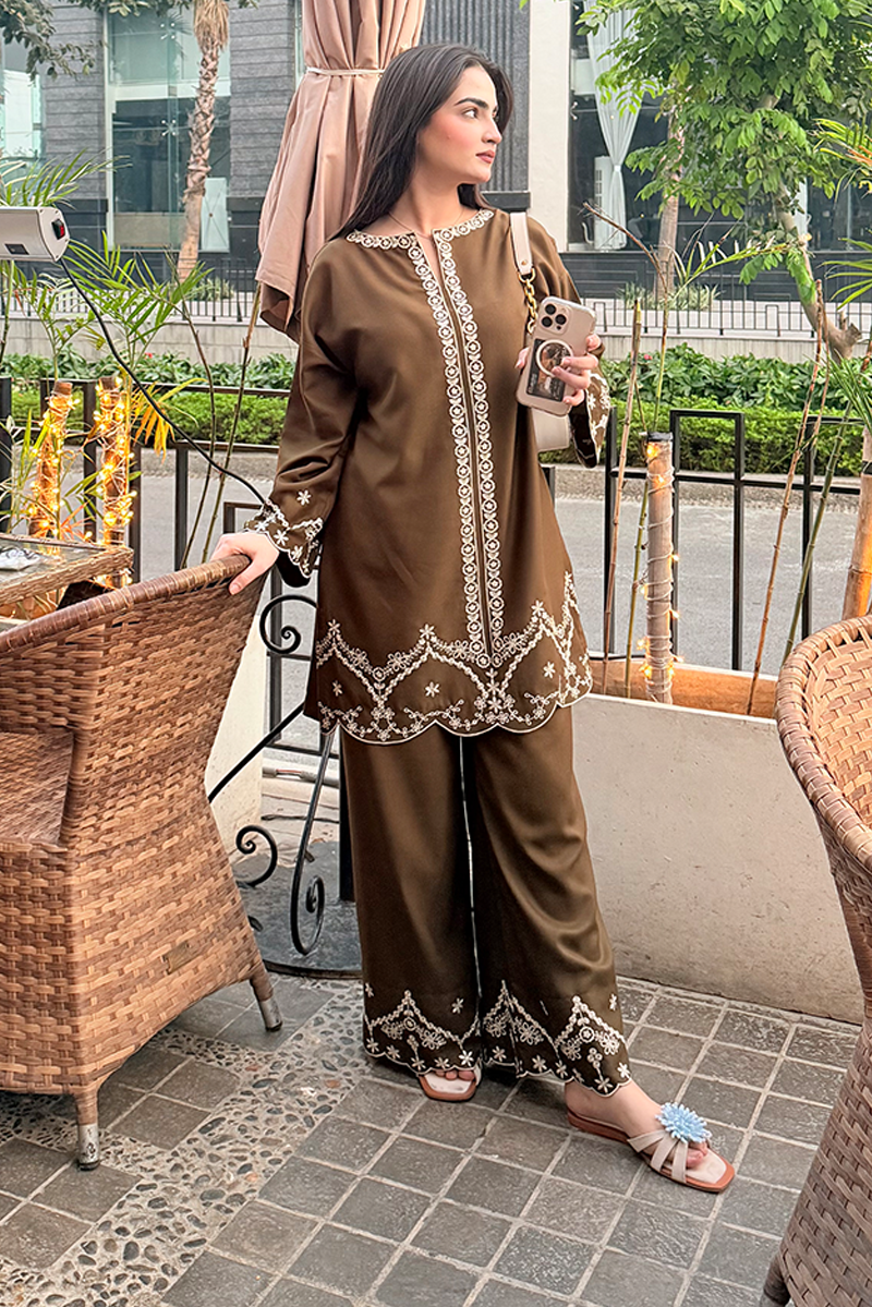 This Olive co-ord set for your winter wardrobe with intricate embroidery on the shirt & cullote pants makes it a perfect fit for your cozy coffee runs.